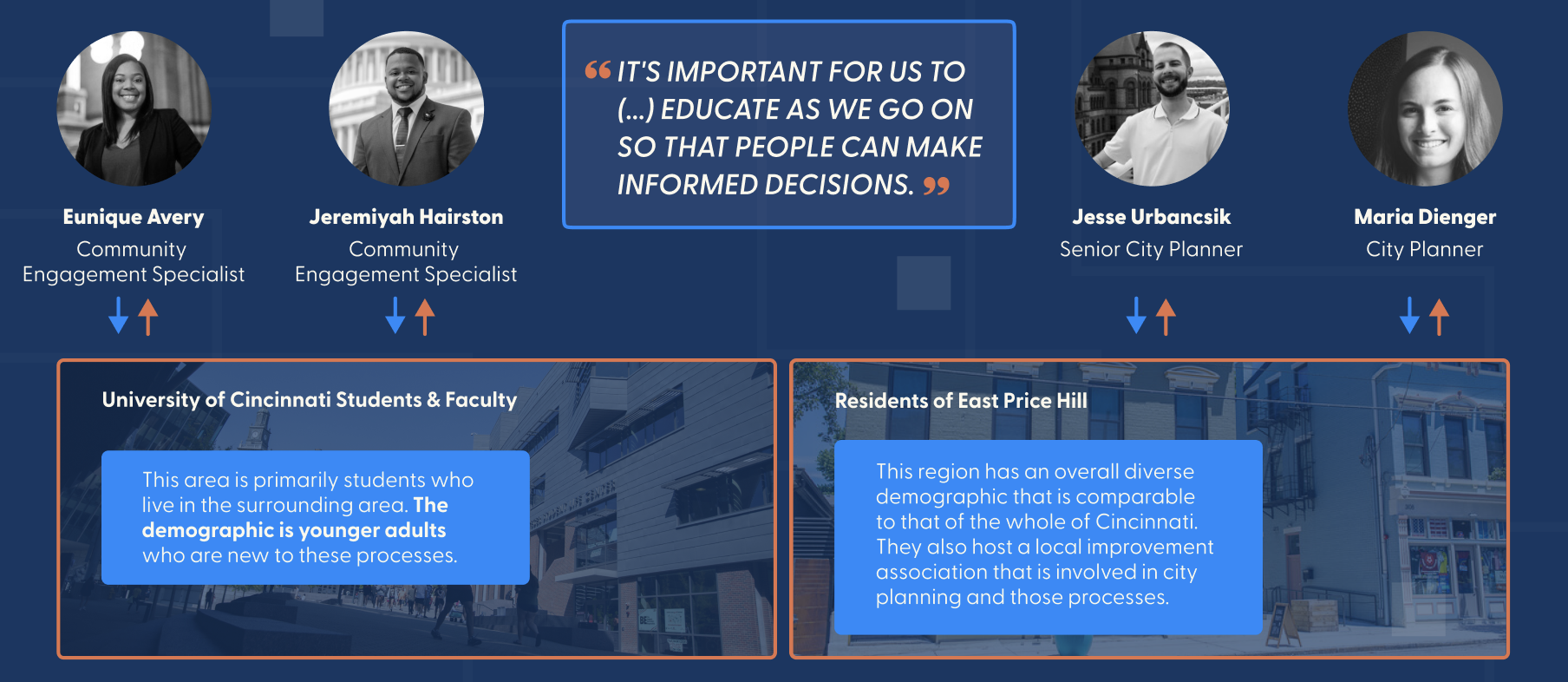 To begin, we met with Cincinnati Community Engagement Specialists as well as City Planners to further understand the process of city engagement, audit their current brand identity, and find what mediums would best serve to provide residents of East Price Hill with the information they need for engage.