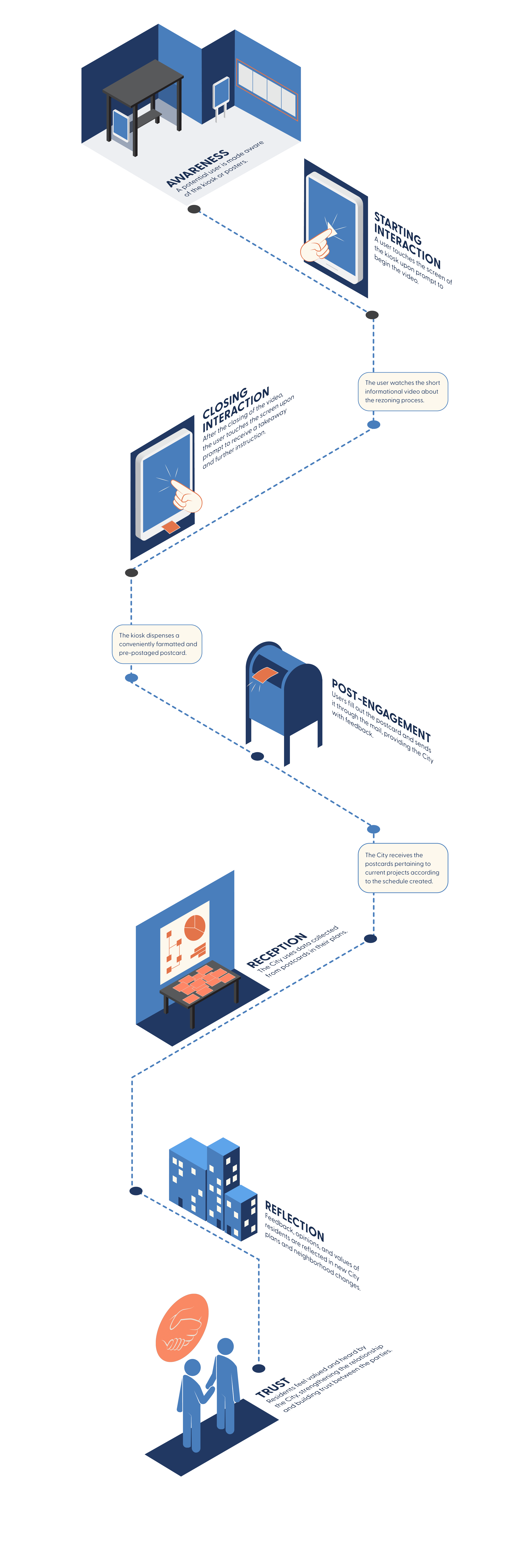 In recent years, there has been a growing disconnect recorded between people and their local government. People often feel unheard and disregarded in the planning process for their communities’ futures. This has sown distrust and frustration into the relationship between residents and their groups of local officials. How might we utilize design to promote trust, transparency, and a stronger relationship between the City and its residents?